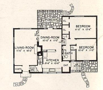 Original floor design as shown in the November 1940 Better Homes & Gardens magazine. Tibbals worked to fit the house into the sloping ravine site as if it had grown there. He made the interior three levels: entrance-level living room, second-level kitchen and dining room, and upper-level bedrooms and bath. This design created the street-front illusion of a single horizontal line. A picket fence disguised how high the ground sloped at the upper end and how near the windows came to the ground. The original taller plantings at the low end gave a feeling of support to the entrance, and made the shrub line appear level.