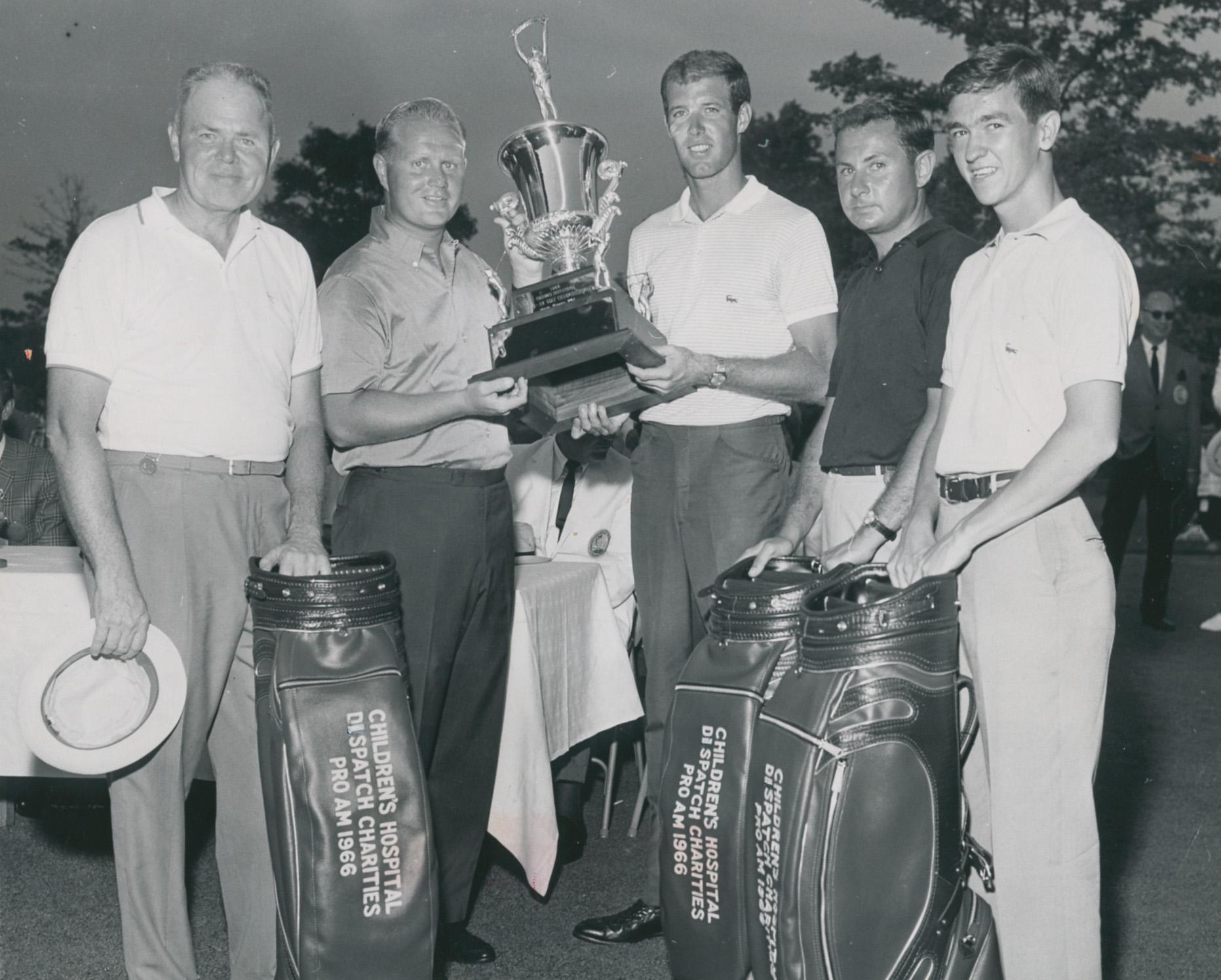 Todd Tibbals, at left in photo, on winning team at the 1st Memorial Tournament Pro-Am in 1966 with Jack Nicklaus (second from left) and Scioto Country Club golf pro Tom Weiskopf (center). Tibbals also designed First Community Village in Upper Arlington, OH, in 1963, which featured California-style architecture in an at-the-time novel approach to housing for different levels of health care. Among Tibbals’ other major works were The Ohio State School for the Deaf on Morse Road in Columbus and Drake Union (1971) at The Ohio State University. He and his partner Noverre Musson (who studied under Frank Lloyd Wright) are credited with bringing modernism to Columbus.